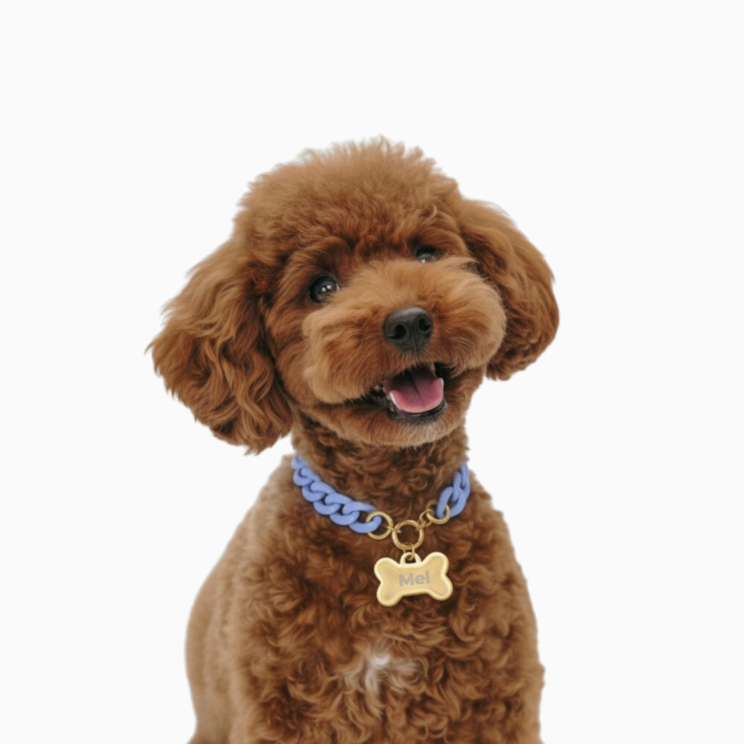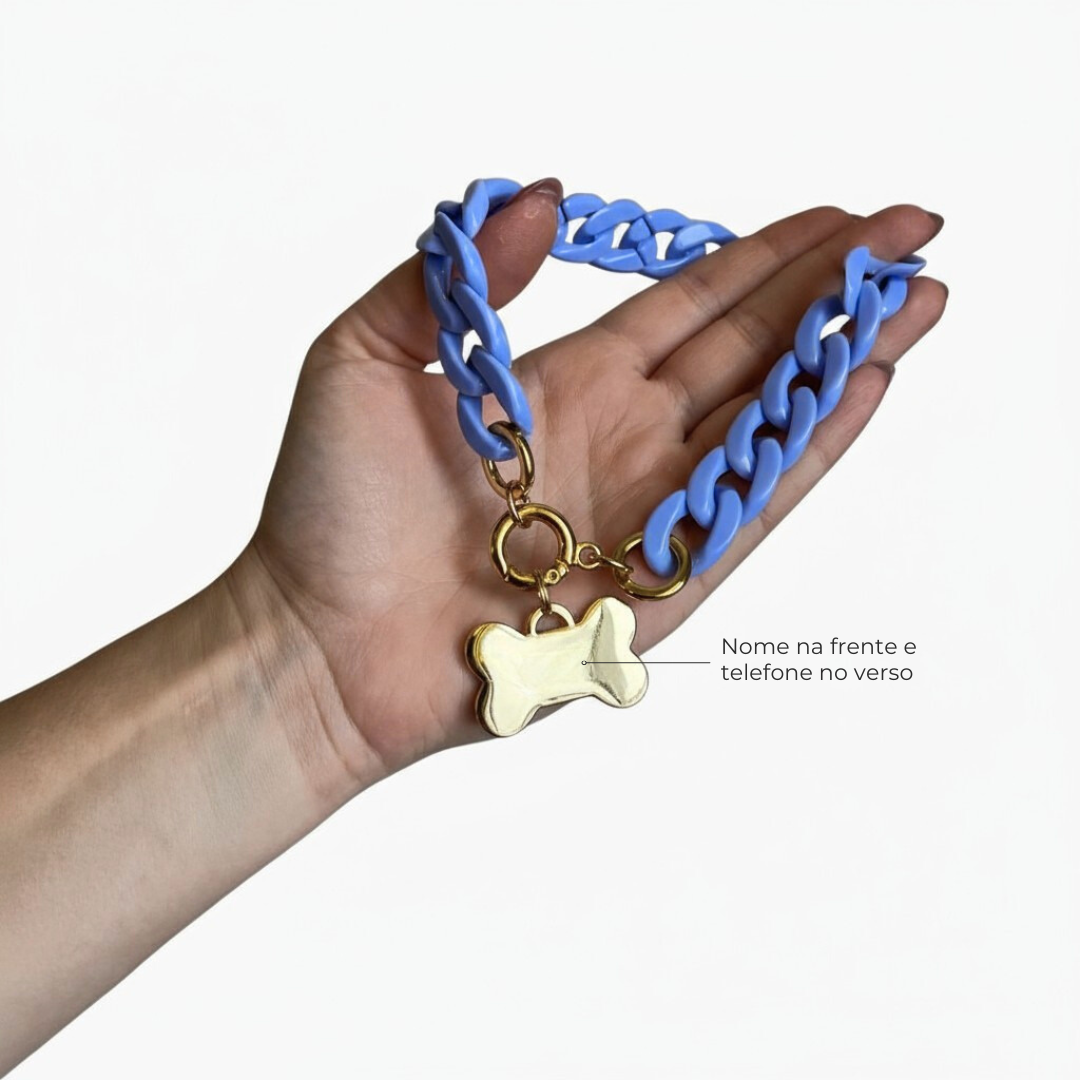 • Pingente gravado a laser com o nome do pet na frente e o telefone do tutor no verso