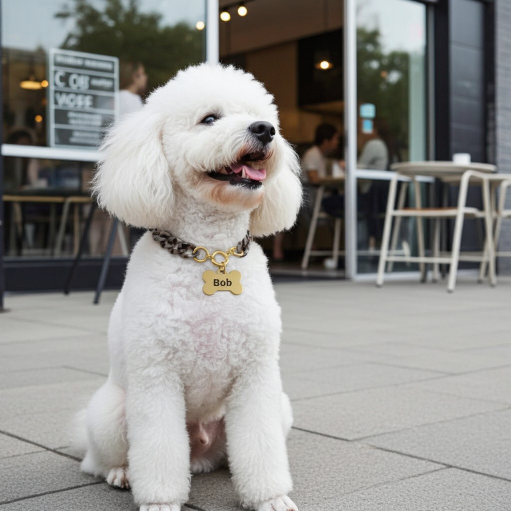 • Pingente gravado a laser com o nome do pet na frente e o telefone do tutor no verso
