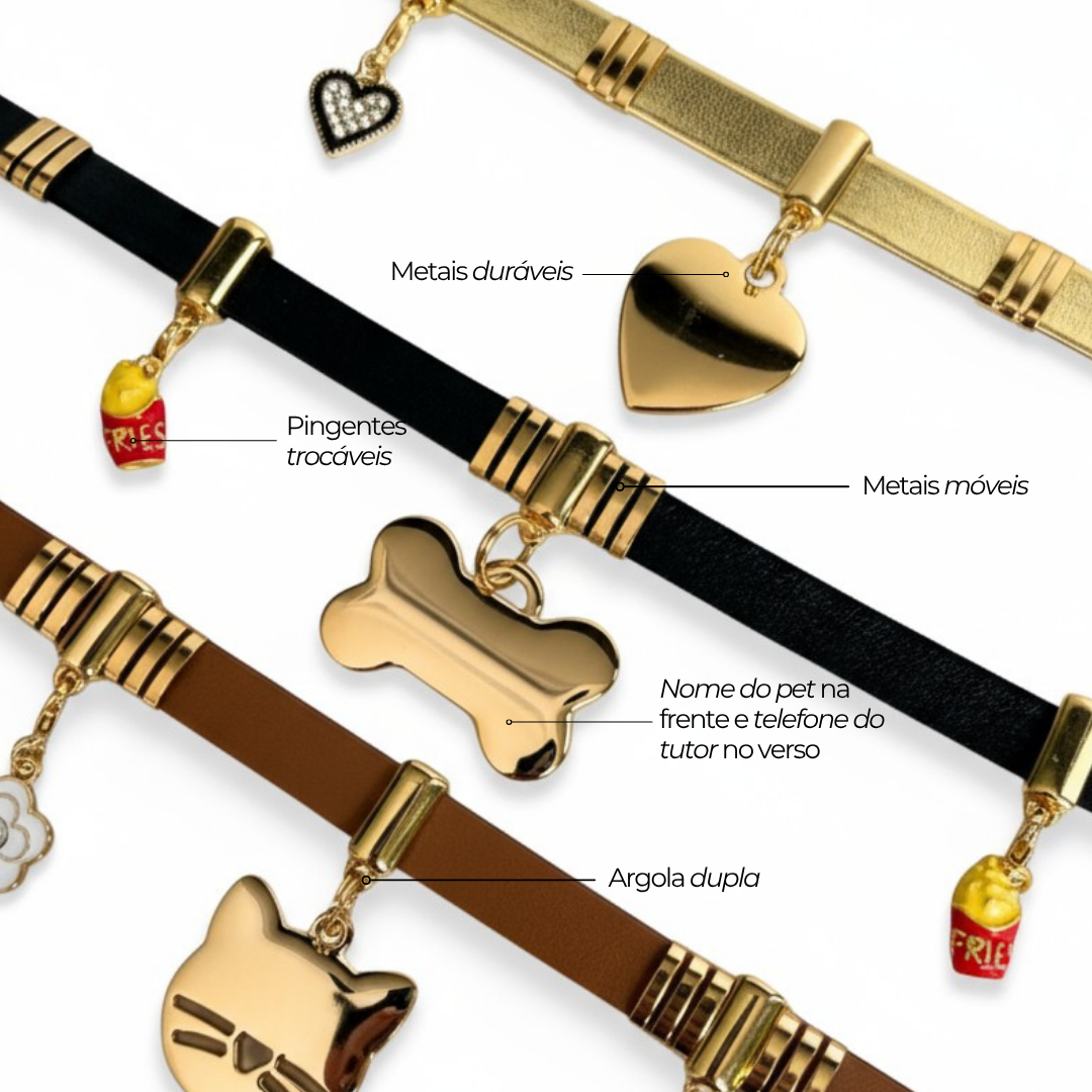 A Coleira Signature é a escolha perfeita para quem busca estilo, conforto e exclusividade para seu pet. Feita à mão no Brasil com poliuretano de alto padrão e metais resistentes à oxidação, ela garante durabilidade e sofisticação. A gravação a laser na tag de identificação e os pingentes personalizáveis tornam cada coleira única e cheia de personalidade. Ideal para gatos e cães de pequeno e médio porte, ela foi pensada para ser confortável e prática, podendo ser usada o tempo todo sem causar desconforto.