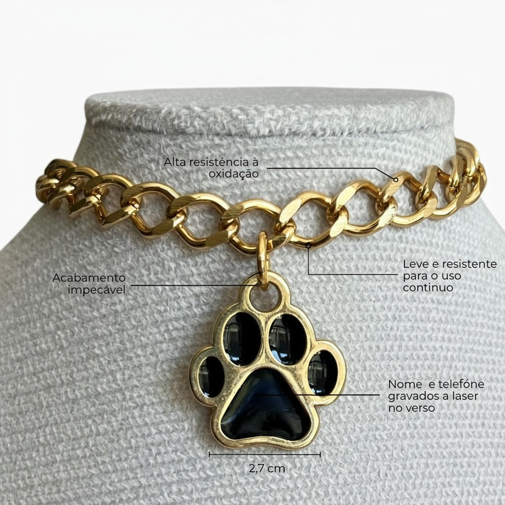 - Identificação segura: Pingente gravado a laser com o nome do pet e o telefone do tutor, não desgasta com o tempo.